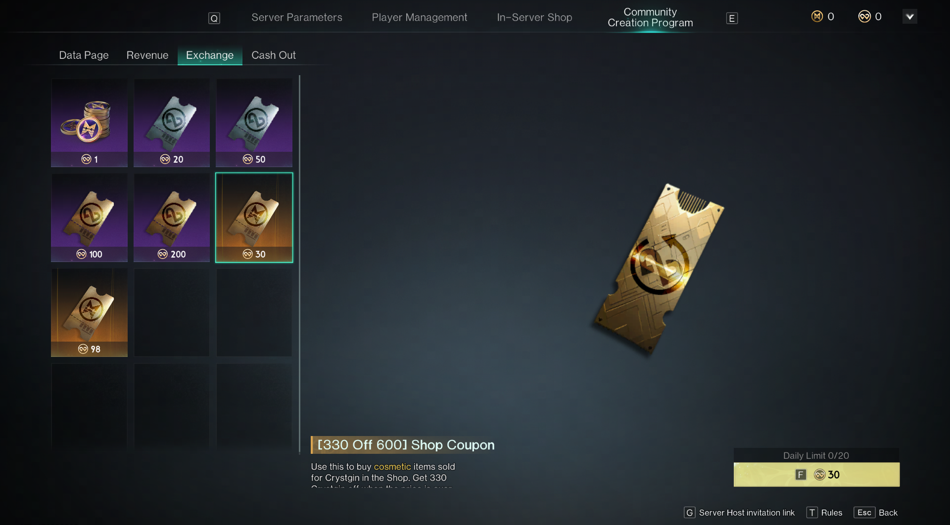 サーバーホストはここで創世コインを使用してさまざまなアイテムと交換できます。現在交換可能なアイテムは、スターソース、カスタムサーバー(あそぶ時間の)長さ割引券、ショップのクーポンの3種類です