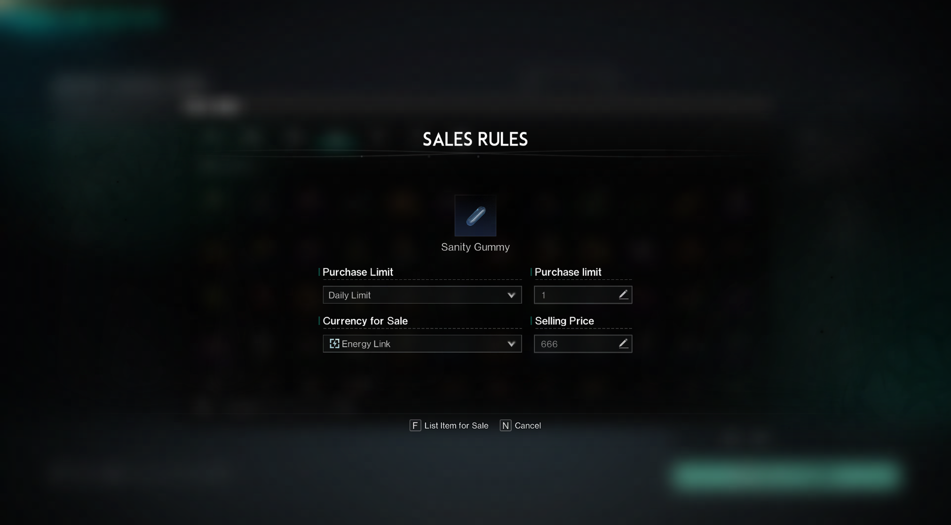 販売するアイテムを選択した後、サーバーホストはそのアイテムの販売可能数量、販売通貨、および販売価格を設定できます
