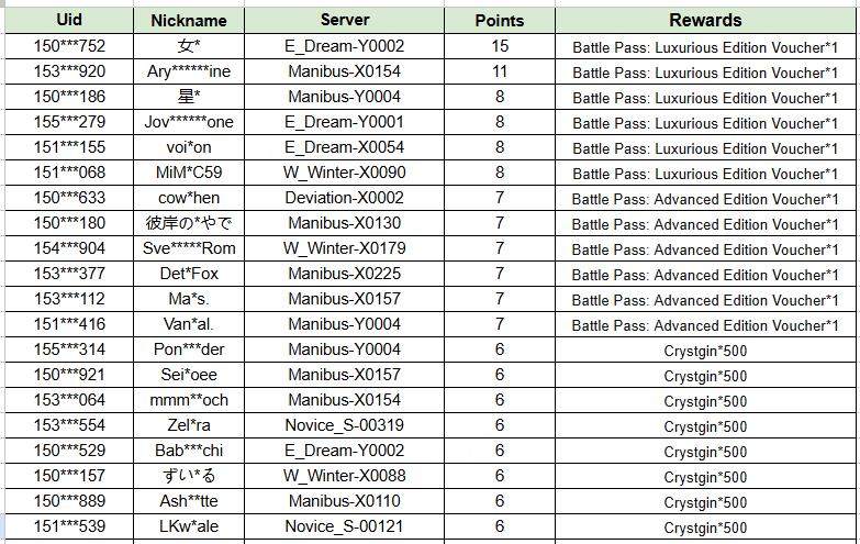 リストが非常に長いため、このページでは上位3つの階層の報酬(バトルパス:デラックス版割引券*1/バトルパス:上級版割引券*1/スターソース*500)のプレイヤーリストのみを表示しています。完全な受賞者リストは以下のリンクで確認できます:https://docs.google.com/spreadsheets/d/1FZDMAXi0v_zOdcJD3uB-Ura0J3AQPL9PcMSiOW-lhfk/edit?usp=sharing