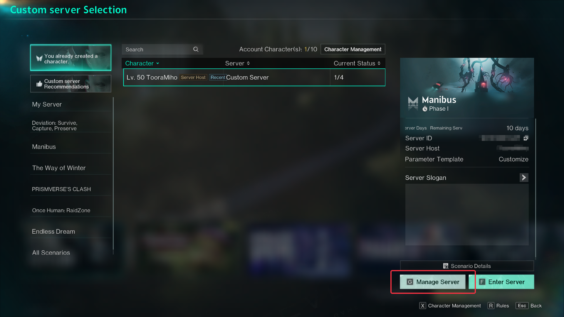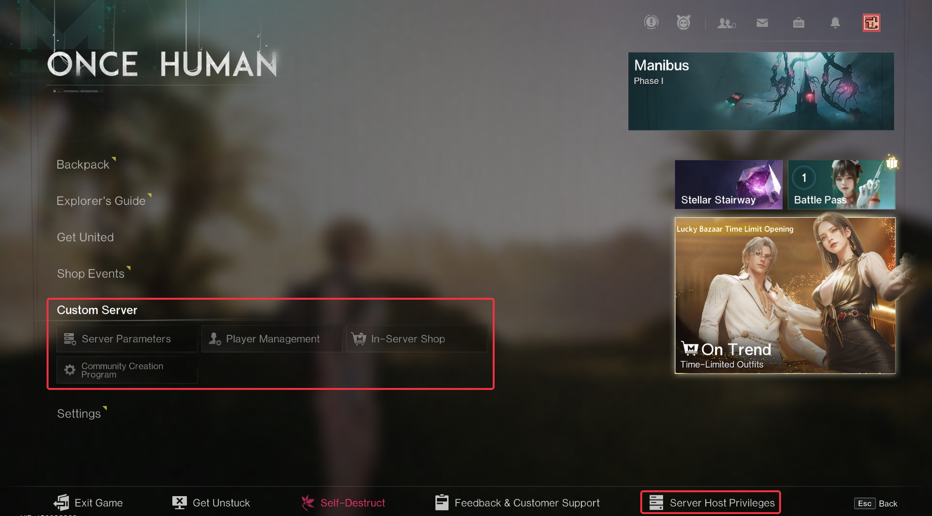 본 튜토리얼 문서는 현재 지속적으로 업데이트 중이며, 수시로 콘텐츠 보완 및 오류 수정이 진행됩니다. 메타 여러분께서 읽으시는 중에 개선사항이나 건의할 부분이 있으시면, 저희 서버 마스터 커뮤니티에 가입하셔서 [Discord: https://discord.gg/oncehuman Custom Server Discussion] 피드백을 제출해 주시기 바랍니다.