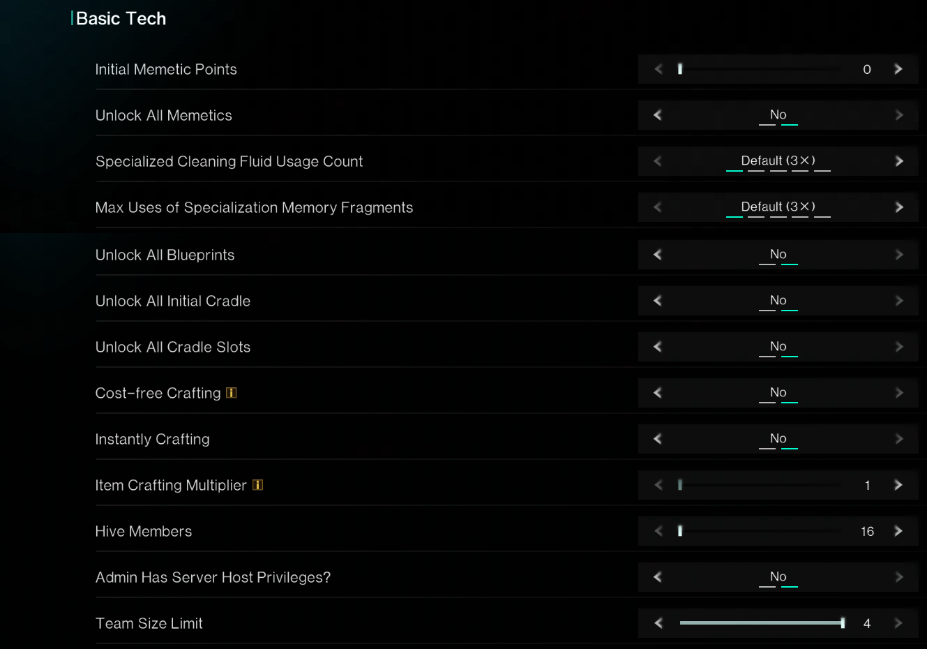 플레이어 캐릭터의 과학기술, 제작, 사회적 상호작용 및 관리 측면의 시작점과 효율성을 일괄 조정하여 서버가 "편안한 탐험", "빠른 성장", 또는 "깊이 있는 체험" 중 어떤 전체적인 스타일을 가질지 빠르게 정의할 수 있으며, 게임의 리듬과 사회적 구조를 크게 변화시킬 수 있습니다.
