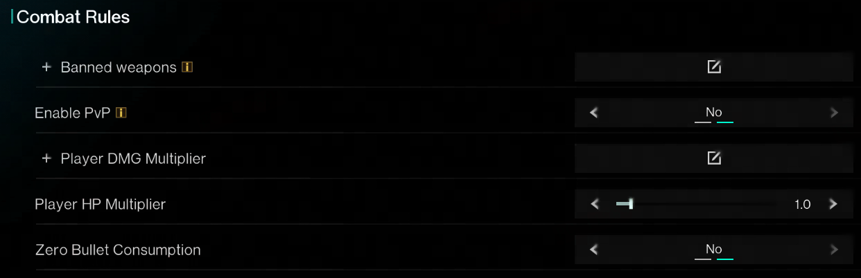 PvP 스위치, 데미지/HP 조정, 탄약 소모 관리 등을 통해 전투 대결 경험을 완전히 커스터마이징할 수 있으며, 서버의 "평화로운 건설", "전술적 경쟁" 또는 "쾌적한 몰아치기" 스타일을 자유롭게 정의하여 기대에 부합하는 핵심 게임플레이 규칙을 형성합니다.