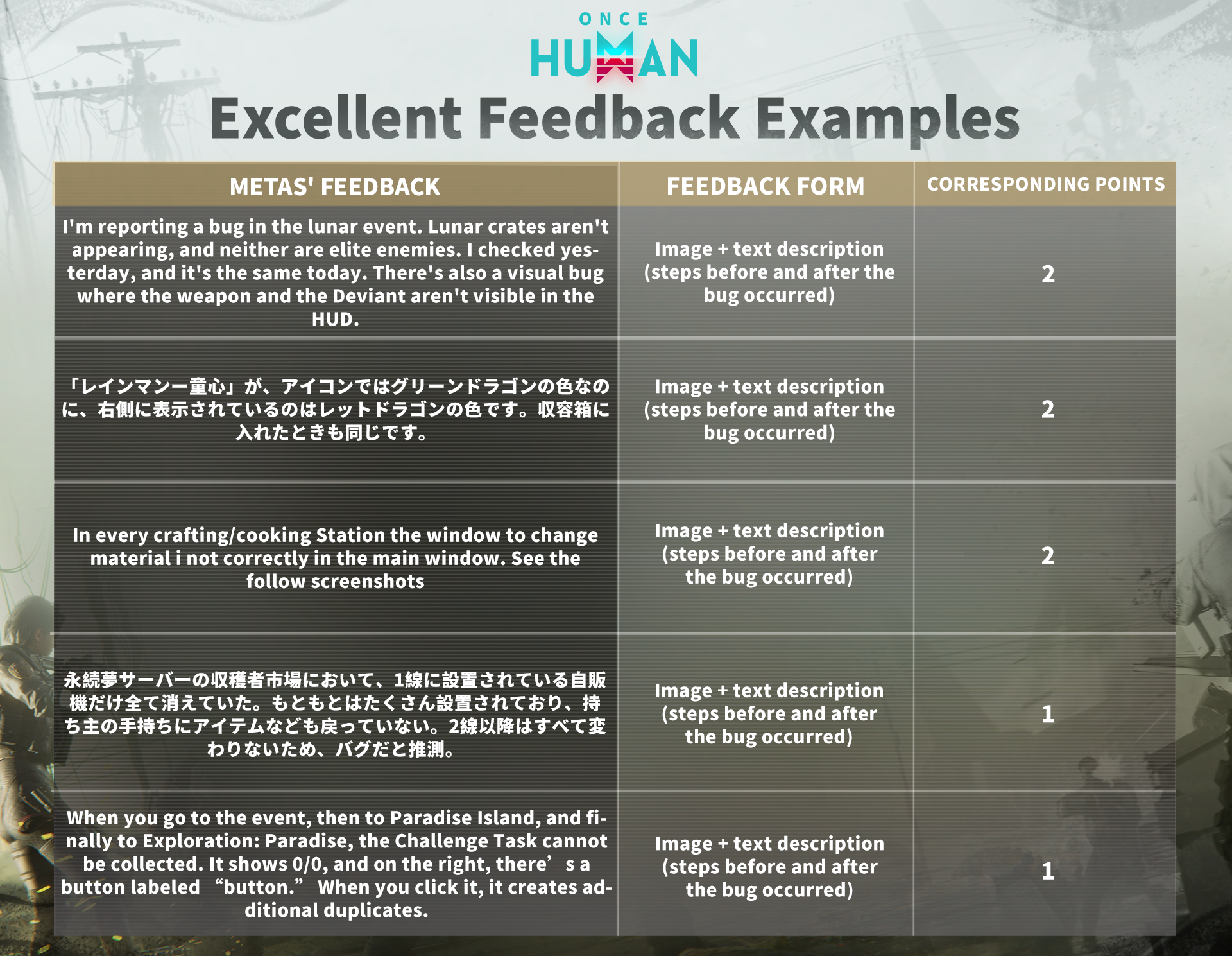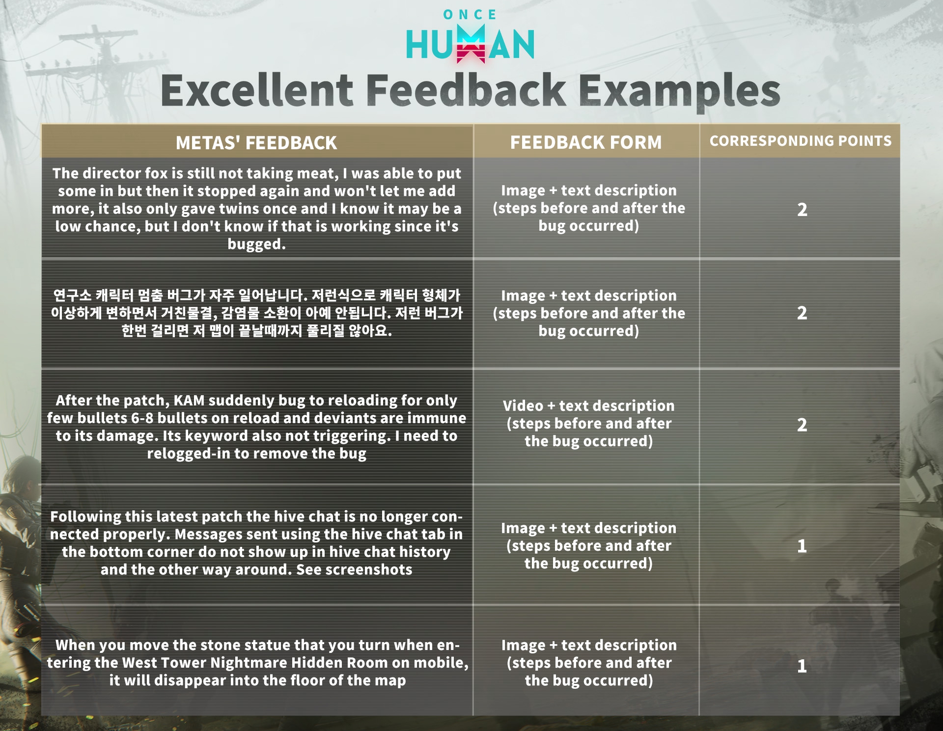 이벤트 기간: 총 4주간 진행되며, 매주 하나의 주기로 구성됩니다. 이벤트 시작 후 매주 지난 주기 수상자 명단 및 우수 피드백 예시, 버그 수정 진행 상황 공지, 다음 주기 고득점 현상금 미션 안내가 함께 업데이트됩니다.