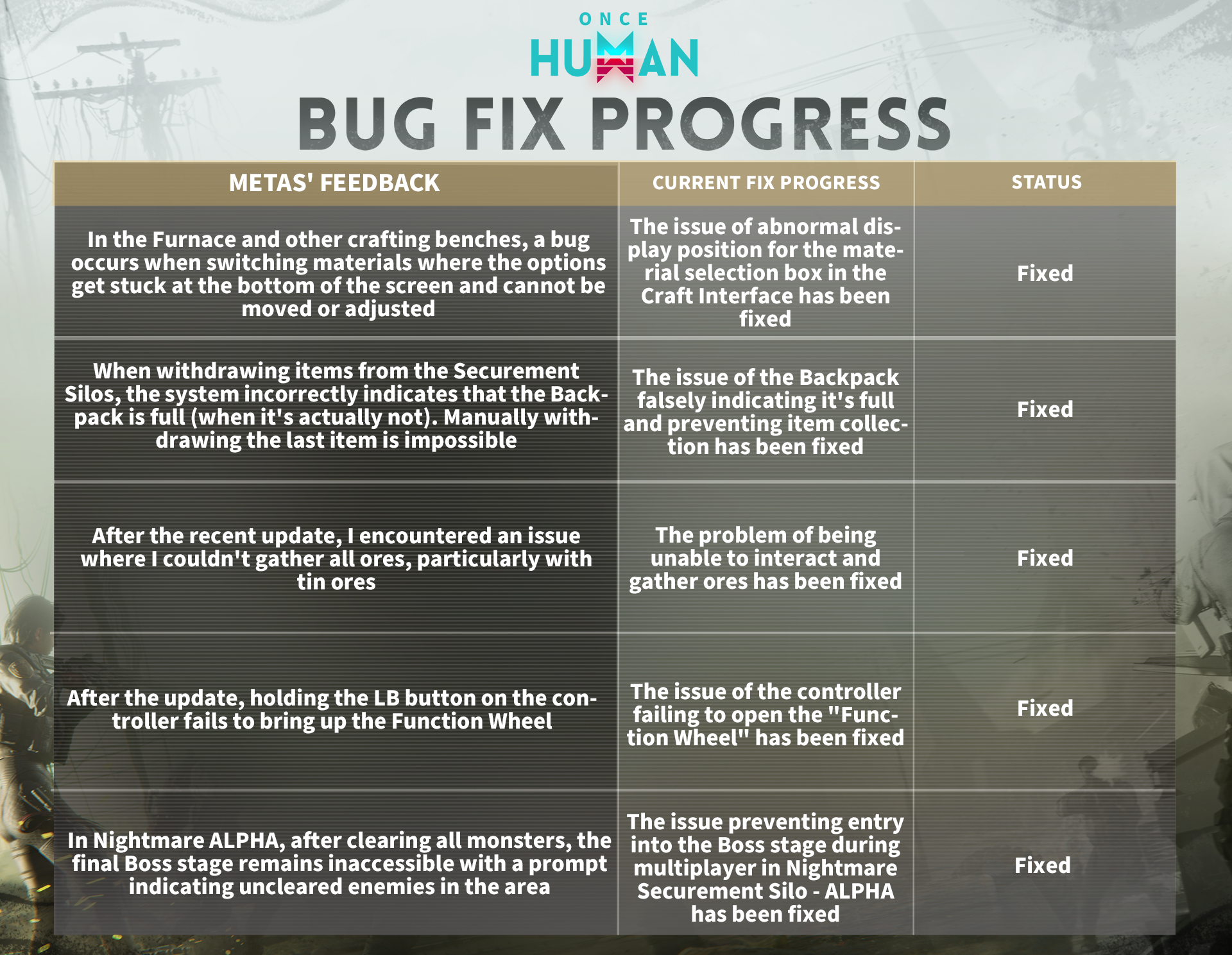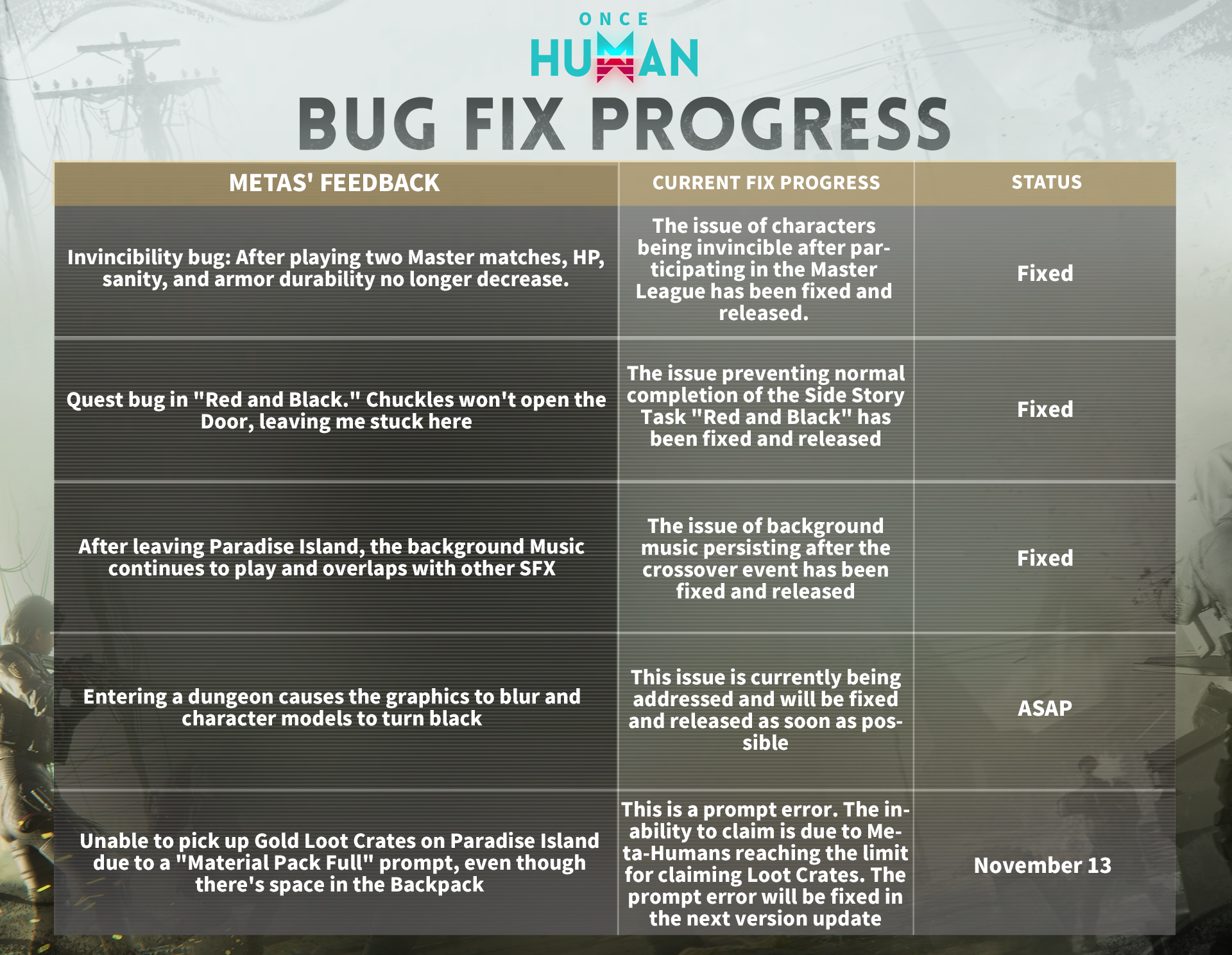 이번 【버그 잡기 보상 이벤트】에 대한 여러분의 지원과 사랑에 감사드리며,현재 이벤트는 종료되었습니다. 이벤트 기간 동안 총 34,282건의 플레이어 피드백을 받았으며, 그중 유효한 버그 피드백은 31,538건이었습니다. 총 692개의 문제 티켓을 추출했으며, 그중 526개는 버그 문제로 확인되었습니다. 현재까지 262개의 버그가 수정되었으며(빈번한 피드백 문제를 우선적으로 수정), 나머지 263개의 버그 문제는 계속 조사 중이며 수정 속도를 높이고 있습니다. 메타 휴먼 여러분께서 날코트 대륙을 탐험하는 동안 의심스러운 버그 문제를 발견하시면 게임 내 고객센터를 통해 지속적으로 피드백을 제공해 주시길 바랍니다!