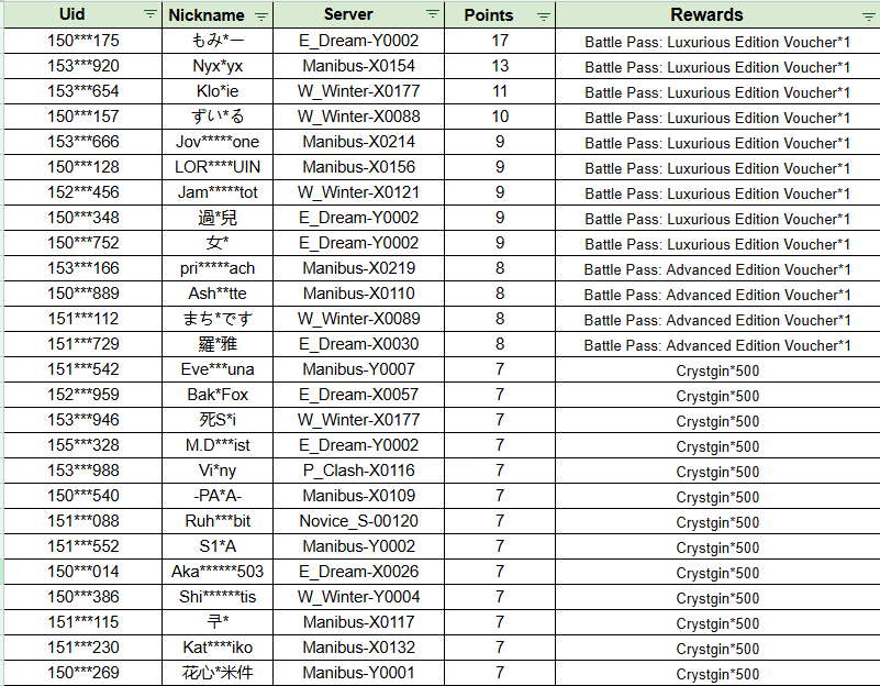 명단이 너무 길어 본 페이지에서는 상위 세 단계의 보상만 표시합니다. (배틀패스: 프리미엄 버전 할인권*1/배틀패스: 고급 버전 할인권*1/스타 오리진*500) 플레이어 명단은 아래 링크에서 전체 수상 명단을 확인할 수 있습니다:https://docs.google.com/spreadsheets/d/1FZDMAXi0v_zOdcJD3uB-Ura0J3AQPL9PcMSiOW-lhfk/edit?usp=sharing