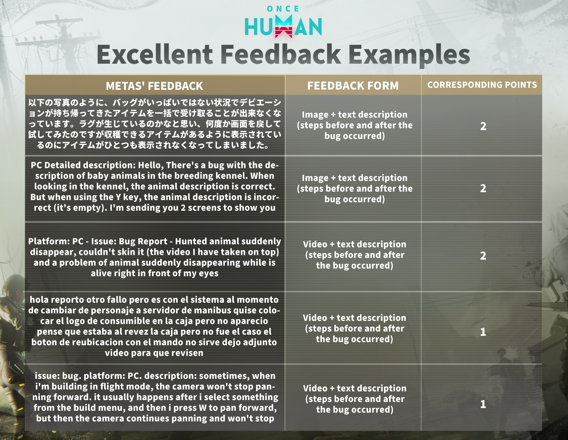 이벤트 기간: 총 4주간 진행되며, 매주 하나의 주기로 구성됩니다. 이벤트 시작 후 매주 지난 주기 수상자 명단 및 우수 피드백 예시, 버그 수정 진행 상황 공지, 다음 주기 고득점 현상금 미션 안내가 함께 업데이트됩니다.