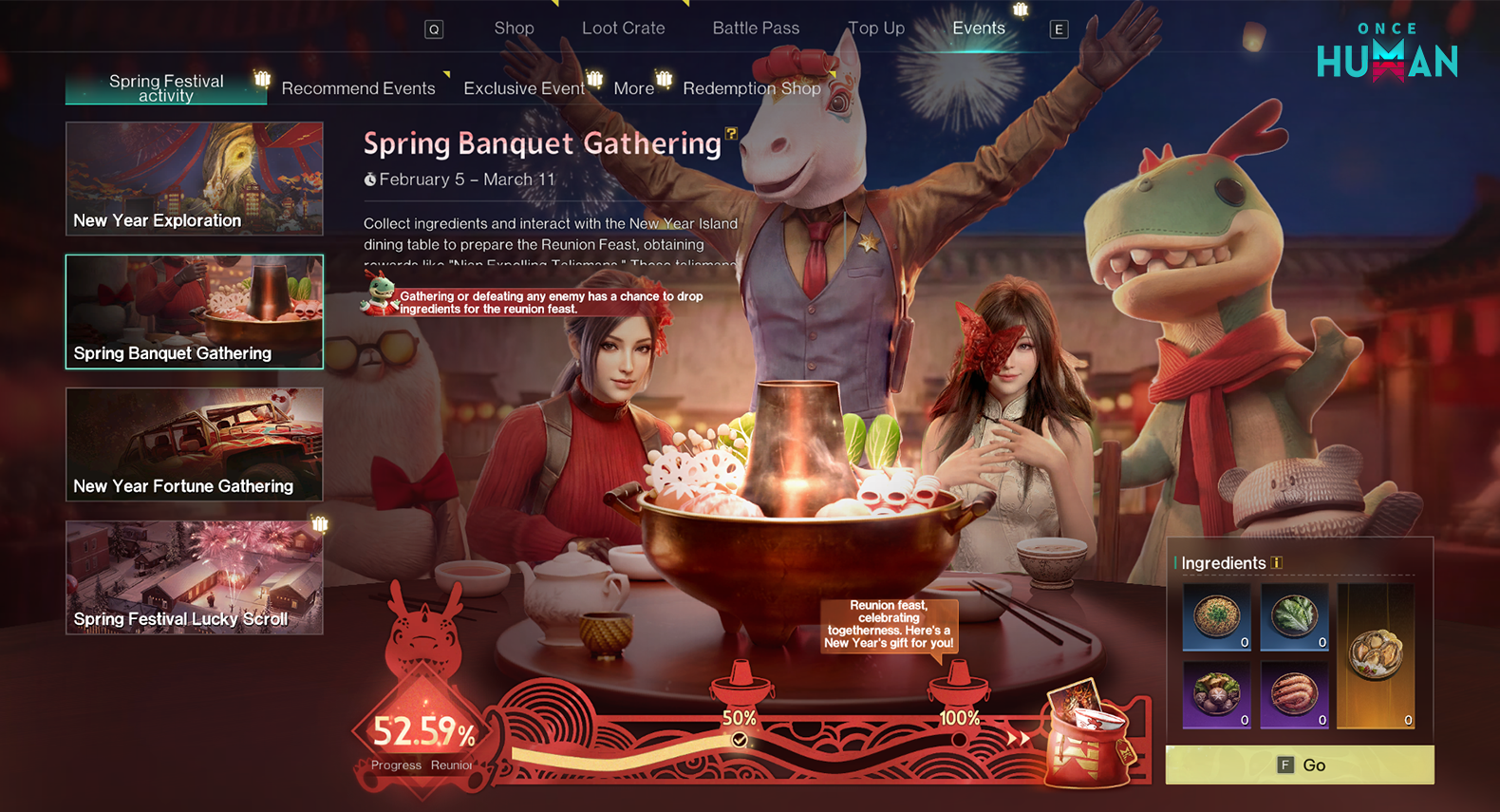 전체 서버 보상: 전체 서버 진행도가 100%에 도달하면 모든 메타 플레이어는 신년 한정 아이콘과 트랜스 아이템 '맛있는 한 그릇'을 받을 수 있습니다.