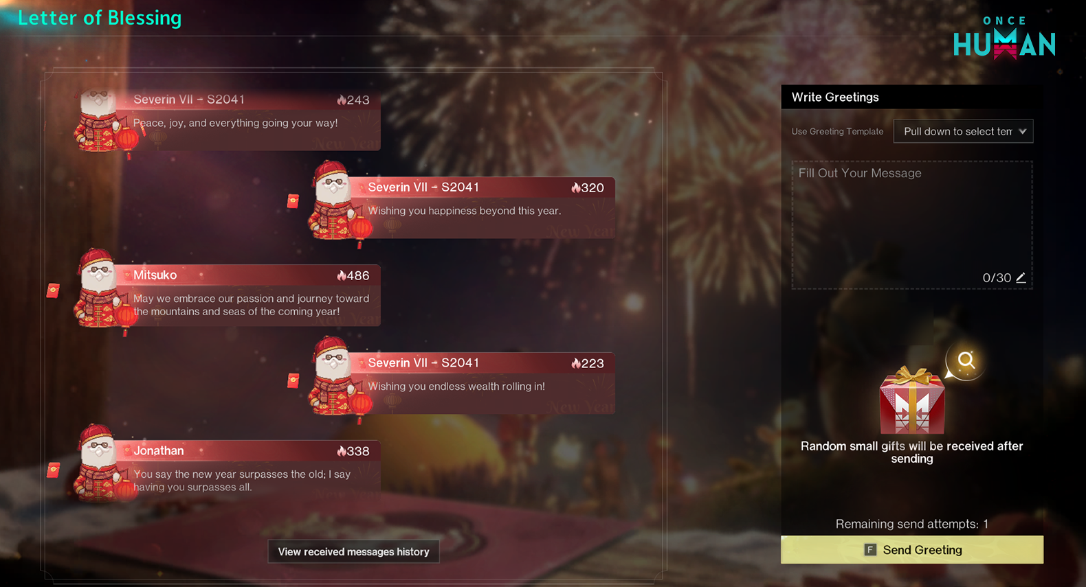 *이벤트 기간 중 매일 로그인하면 축하 메시지 보내기 횟수를 1회 얻을 수 있으며, 횟수는 누적됩니다.