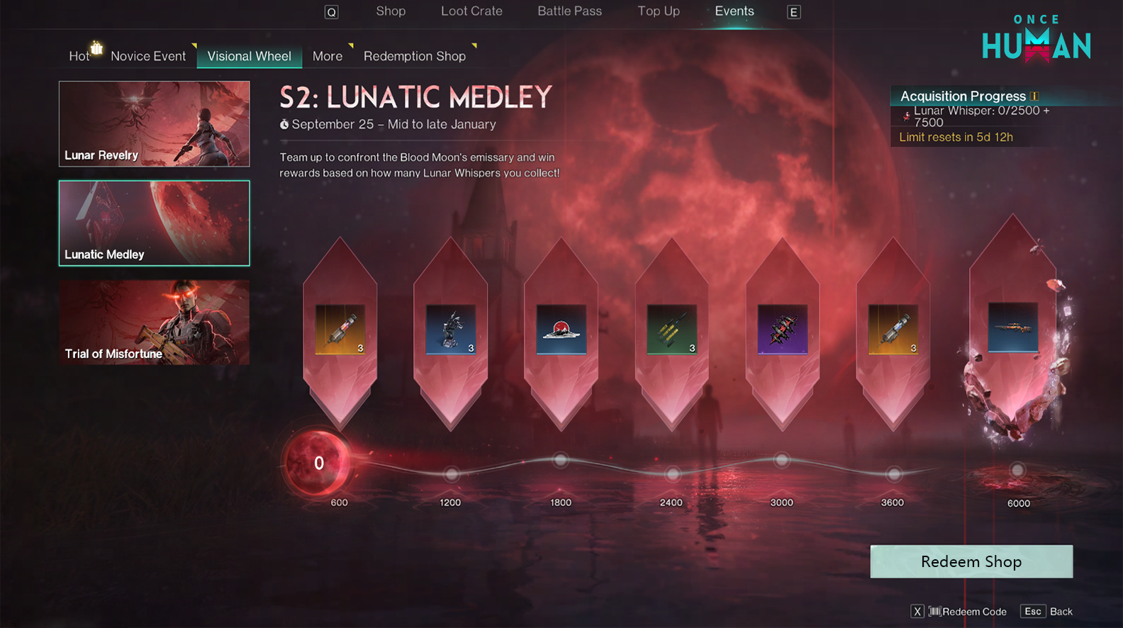 Lunacy causes you to steadily lose Sanity, down to a minimum of 20%, when outside your territory. Defeat enemies to recover your Sanity.During a Blood Moon, you can earn Lunar Whispers by defeating enemies and participating in various game modes. When you have Lunacy, the lower your HP, the more Lunar Whispers you will obtain. Lunar Whispers are time-limited and expire after 24 hours.If you black out, you will recover from Lunacy and lose a certain quantity of Lunar Whispers.When infected with Lunacy, you can see hidden Oracle Crates in settlements and more deviated plants in the wilderness. However, gathering resources in the wilderness may trigger Deviant attacks.