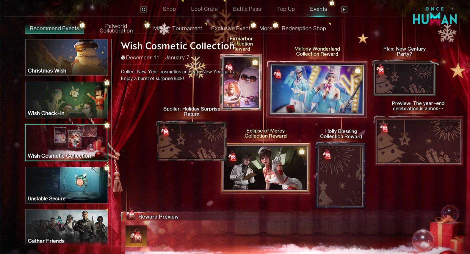 Rewards include Starchrom Crates, Butterfly's Emissary Crates, mod parts, and other rare rewards, as well as the limited furniture item Firmarbor: Eternal Life, Christmas Deviation Selection Gift Boxes, New Year Cosmetic Selection Gift Boxes, and Wish Stones! New Year Cosmetic Selection Gift Boxes may contain Snowflake Beanie, Hide-and-Seek Headwear, Red Winter Hat, Cradle Charm: Everlasting Starlight Tree, Metallic-Scaled Gauntlets, and many other cosmetics and furniture dyes. Don't miss out!