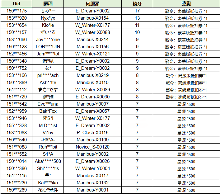 由於名單篇幅過長,本頁面僅展示前三個梯度獎勵(戰令:豪華版抵扣券*1/戰令:高級版抵扣券*1/星源*500)的玩家名單,完整獲獎名單可見連結:https://docs.google.com/spreadsheets/d/1VFqojtPArOGYY_GVgd-o4y-rdds05q7PWTfQCF9xFWg/edit?usp=sharing