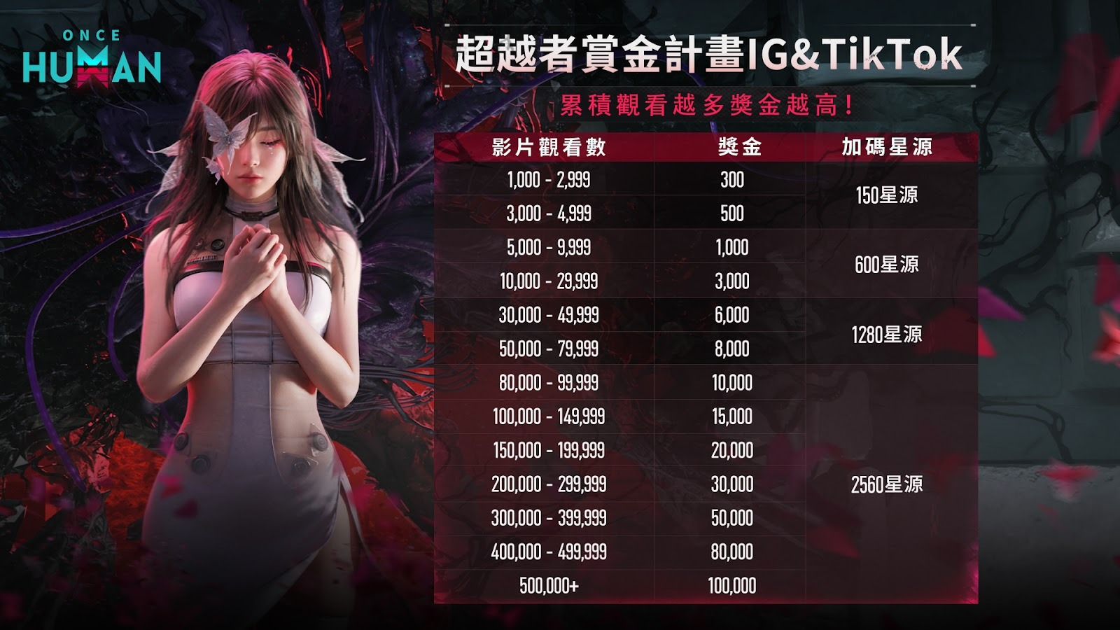 1、透過《Once Human》創作者計畫活動表單進行投稿,活動期間內在YouTube、TikTok、Twitch、IG等平台上傳與領地共建、隊伍合作或挑戰Boss等創意影片、遊玩影片、或攻略影片,累積觀看量達1,000以上則視為有效參與者(不限上傳影片支數)。